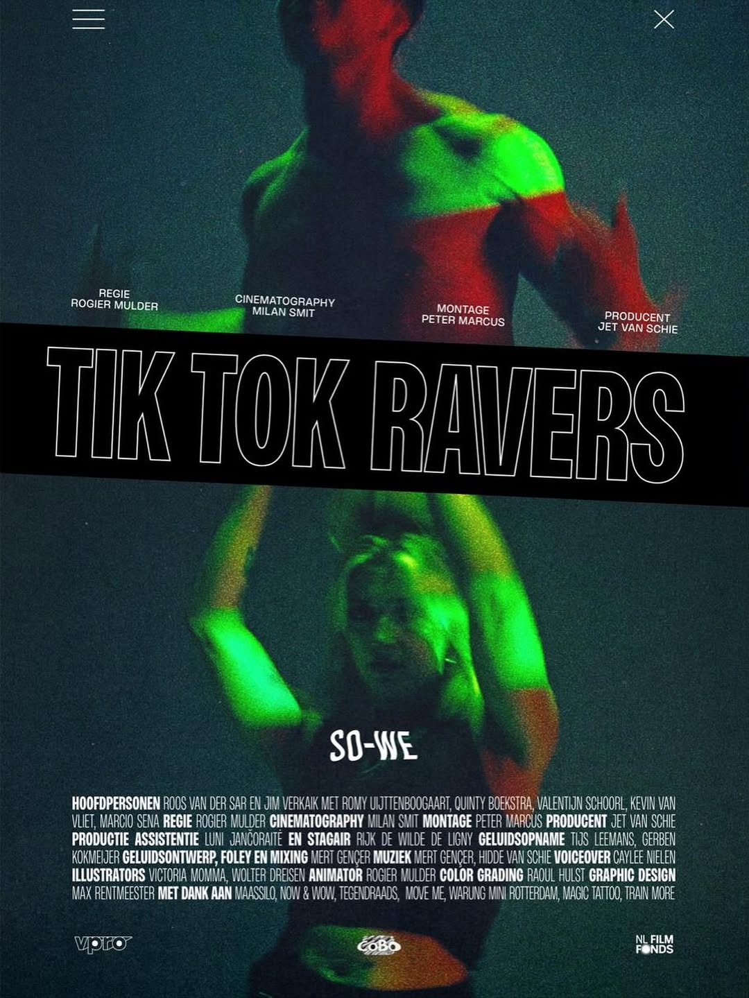 ‘TikTok Ravers’ (2025). A short-documentary. TikTok Ravers tells a story of Jim and Roos, who are techno content creators expressing themselves both online and on the dance floor. In doing so, the boundaries blur between the virtual world and the collective physical moment of the rave.